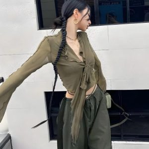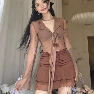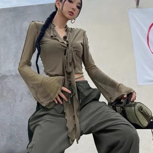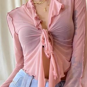 This tie-front mesh top with a playful ruffled edge offers a breezy, youthful style. Wear it with jeans or skirts for a standout look at parties or casual hangouts.