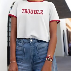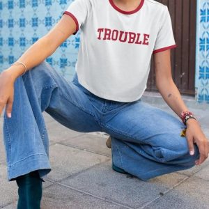 Cropped ringer tee with bold “TROUBLE” lettering. Red trim pops on soft cotton, giving off confident, playful, and retro vibes in true Y2K style.