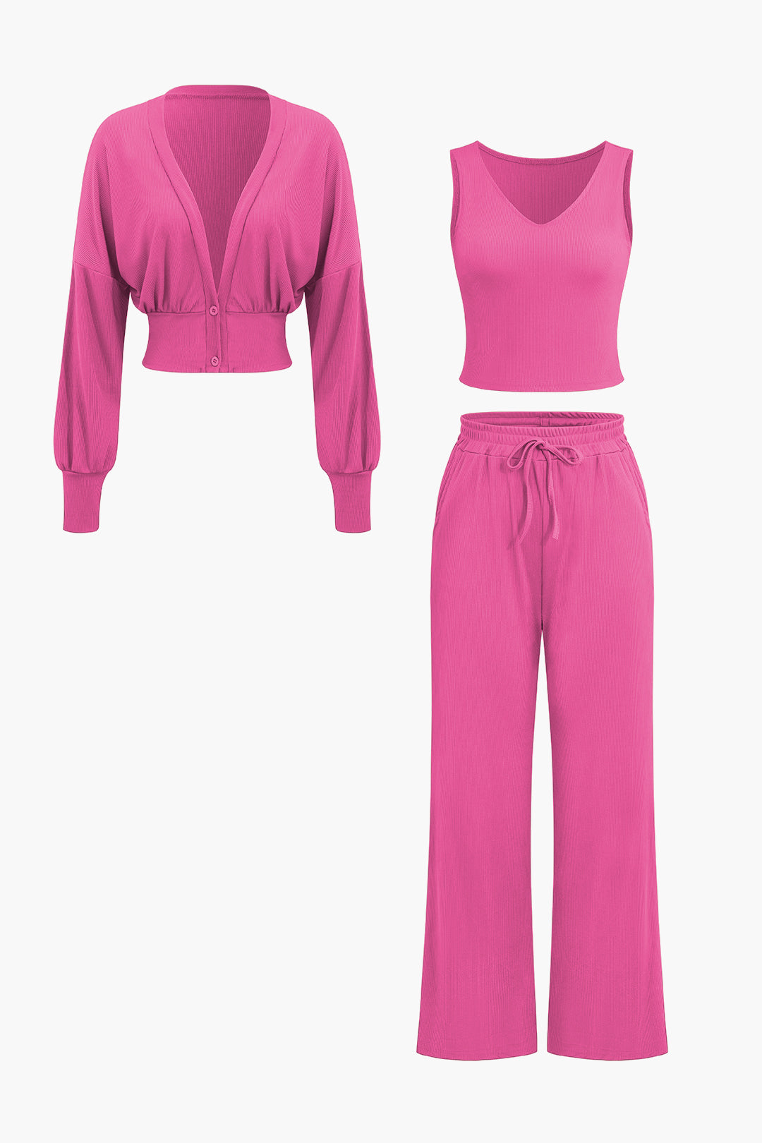 Crafted with high-quality materials, our V-Neck Tank Top offers a flattering fit, while the Button-Up Cardigan adds a layer of sophistication, perfect for transitioning from day to night. The High-Waist Drawstring Pants provide a relaxed yet stylish silhouette, making them ideal for any occasion, from casual outings to more formal events.