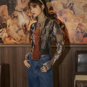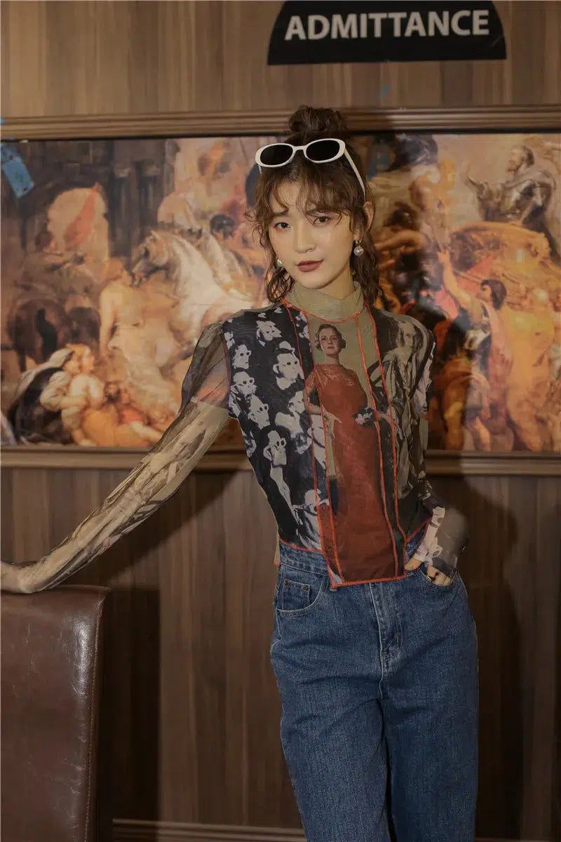 Capture a retro vibe with this vintage aesthetic mesh top, showcasing ’50s theme print details and red sewing accents. The transparent design and high neck add a unique edge, ideal for those who appreciate streetwear with a cool, retro flair.