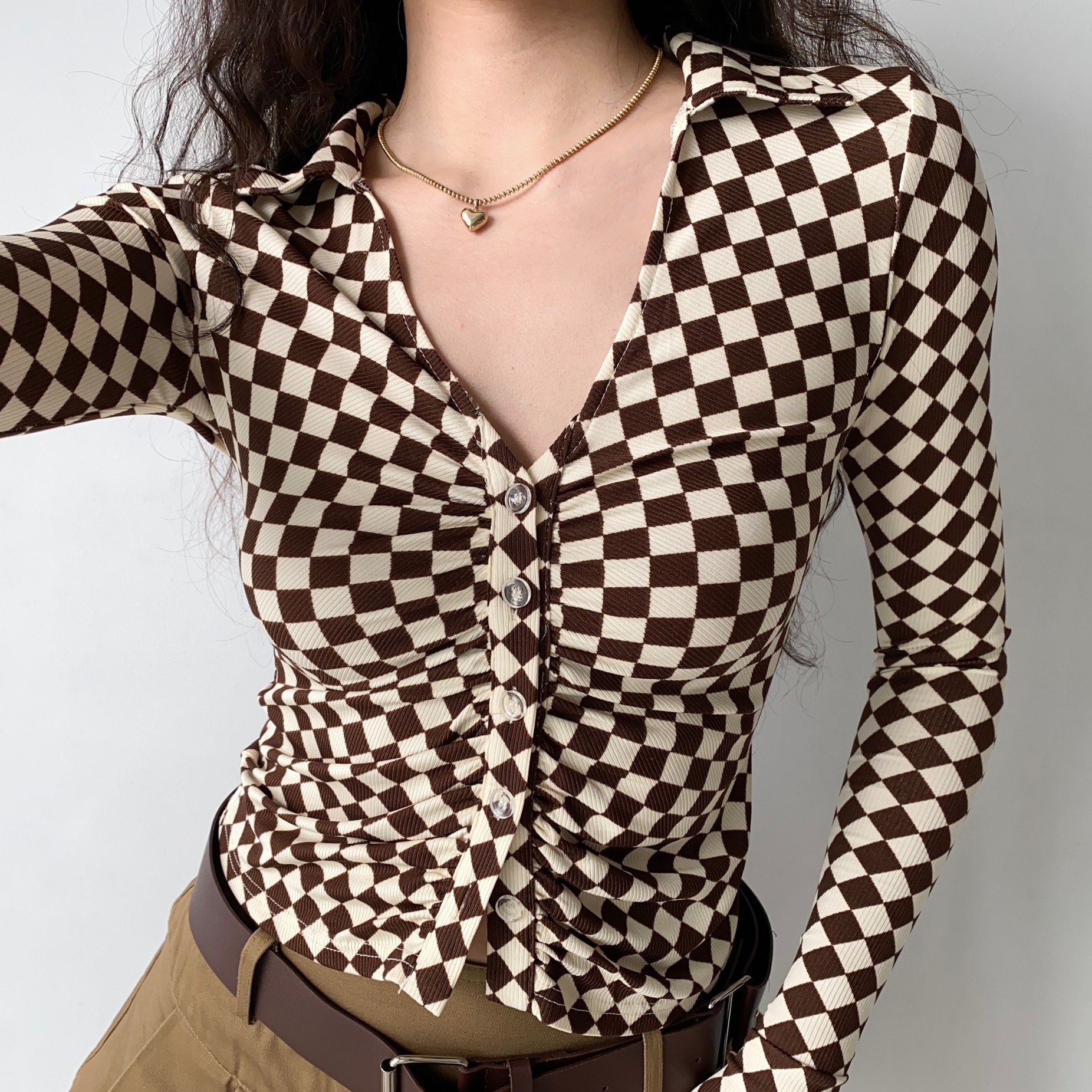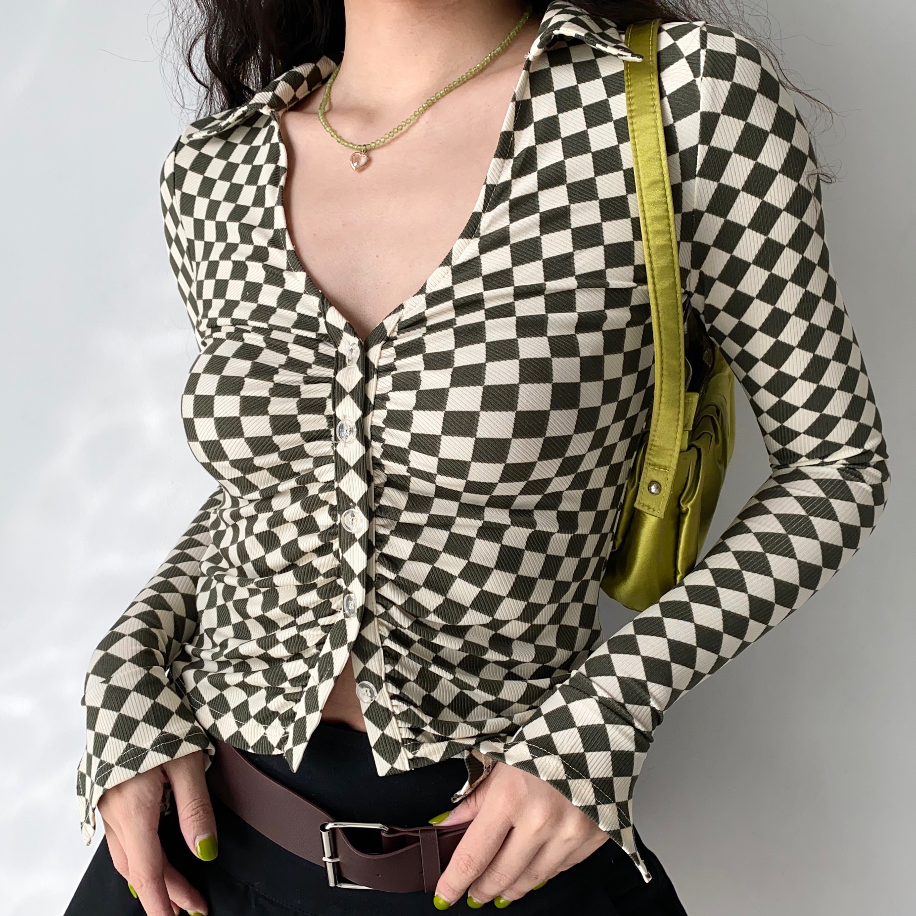 Vintage Checkered Long Sleeve Shirt Deep V- Neck, Bell Sleeves Women Slim Fit Top High-quality product featuring prom dresses, spring outfits, business casual outfits and more. Modern design that fits the latest trends. Premium materials ensure durability and comfort. Order now for special offers! Product designed with attention to every detail. Suitable for all occasions and personal styles.