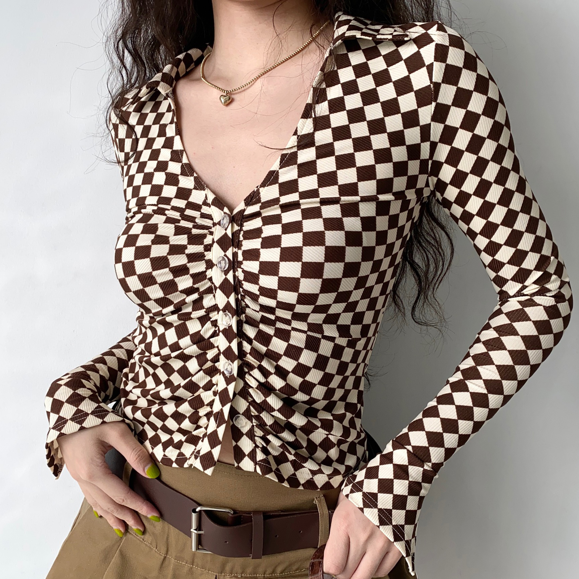 Elevate your wardrobe with our Vintage Checkered Long Sleeve Shirt, designed with a chic deep V-neck and stylish bell sleeves for a touch of elegance. This slim fit top perfectly combines European and American styles, offering a flattering silhouette that complements any body type. Ideal for both casual outings and sophisticated gatherings, this shirt is a versatile addition to your collection. Don’t miss out on this fashion staple—add it to your cart today!