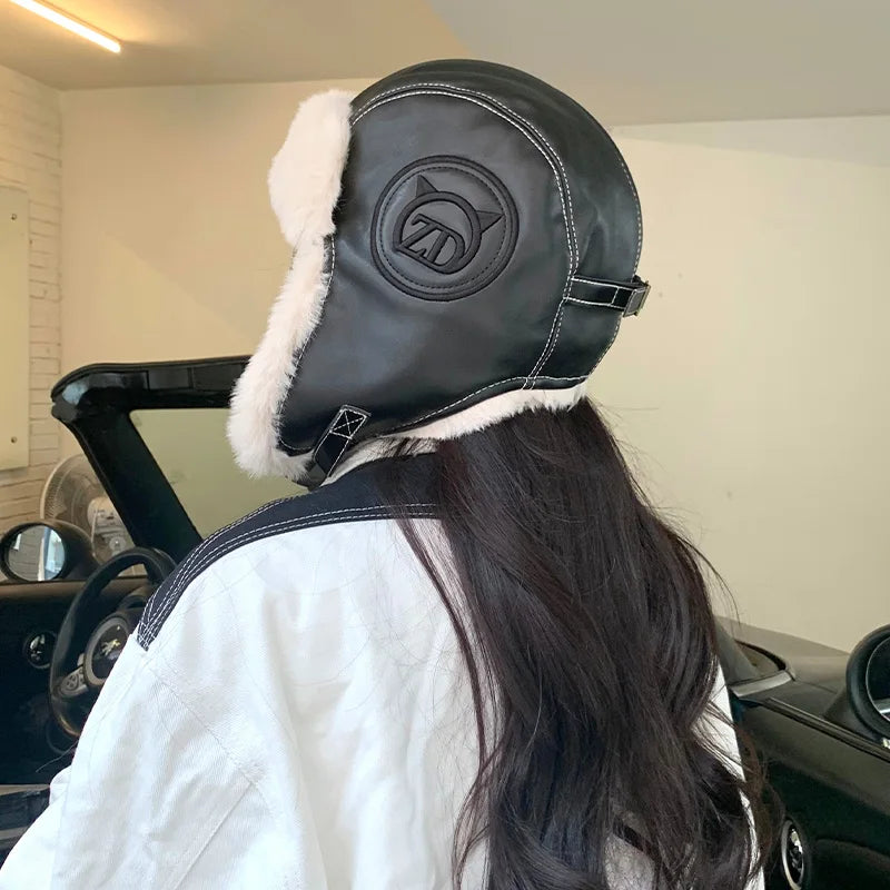 Stay warm and stylish with this vintage-inspired aviator hat. Made from faux leather and lined with faux fur, it includes a belt closure and additional belt detail at the back. Embroidery details on the side add a touch of uniqueness, perfect for a cool streetwear look in winter.