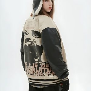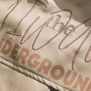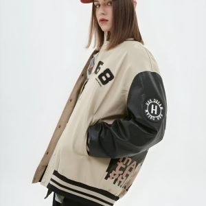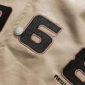 This unisex faux leather varsity jacket exudes a vintage vibe with intricate embroidery at the front and print and text detail at the back. It features invisible pockets, double front pockets, button fastening, and a silicone round label on the sleeve, making it perfect for biker, punk, or streetwear enthusiasts.