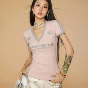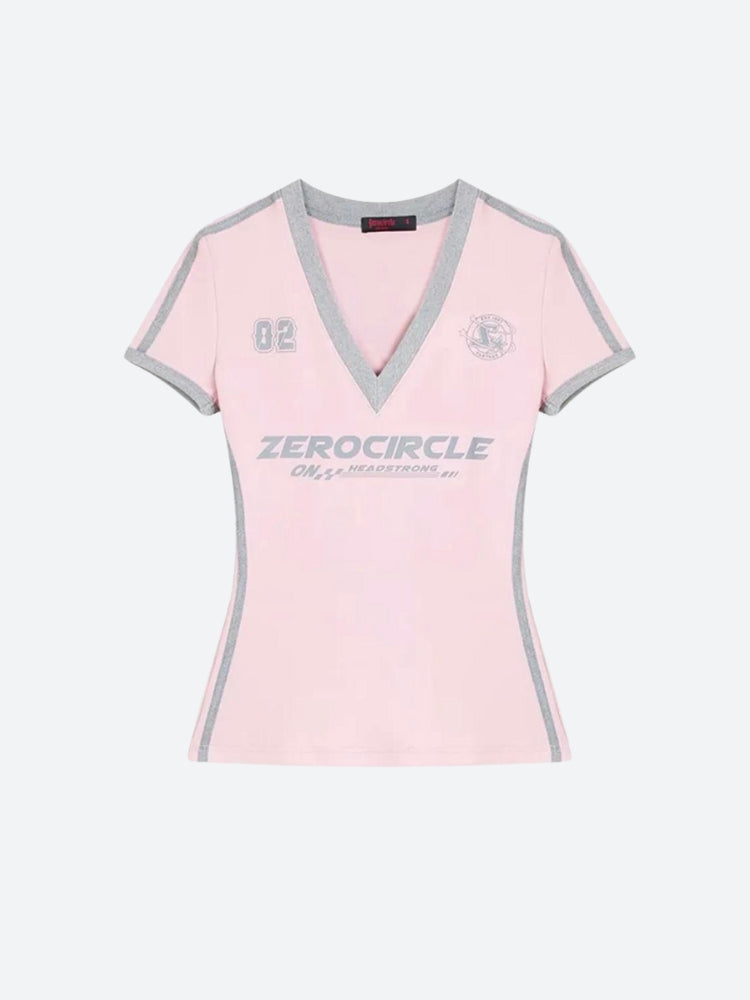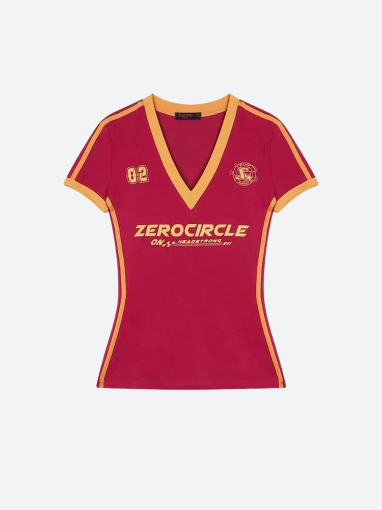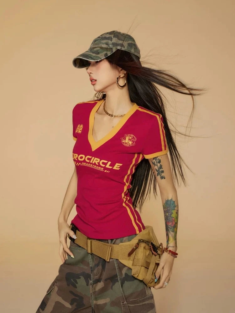 The bold red color, accented with yellow stripes and detailing, captures an athletic spirit, while the fitted design ensures a flattering silhouette. Perfect for casual outings or a stylish twist on athleisure, this top pairs effortlessly with jeans, shorts, or camo pants for a laid-back, confident look. Ideal for those who appreciate a blend of vintage style and modern comfort.