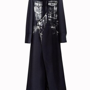 This black, one-piece wonder ingeniously combines a blazer and maxi skirt, presenting a unique take on the distressed aesthetic. With its front button fastening and an array of pockets – two on the hips, two on the chest, and an extra pair at the back, it’s not just fashionable but also practical. The invisible split detail adds a surprising twist, while the cotton-polyester blend ensures comfort. Its lapel collar adds a sophisticated touch. For an edgy look, wear it as a dress or pair with bold accessories. Perfect for those who love to experiment with their style.