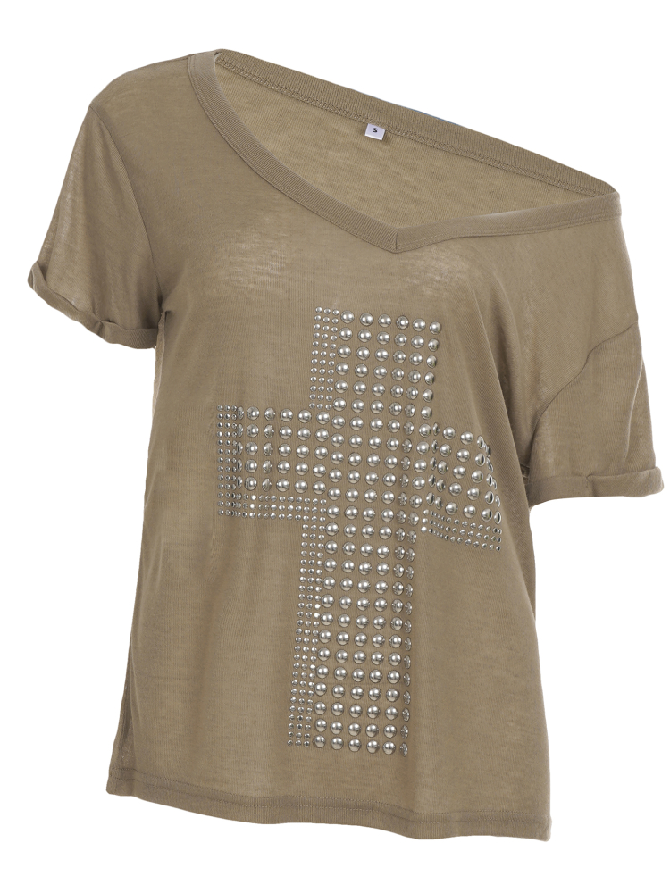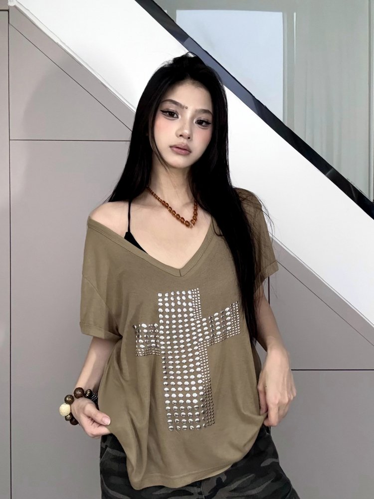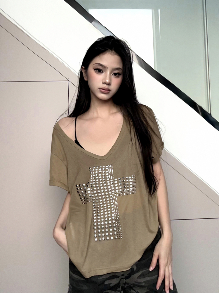 Y2K Cross Copper Foil V- Neck Short Sleeve T- shirt Women Casual Loose Top High-quality product featuring prom dresses, spring outfits, business casual outfits and more. Modern design that fits the latest trends. Premium materials ensure durability and comfort. Order now for special offers! Product designed with attention to every detail. Suitable for all occasions and personal styles.