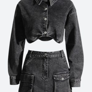 Channel Y2K grunge vibes with our Denim Two Piece Set. The cropped top with an asymmetric hem and the cargo mini skirt with extra-big pockets make a bold statement. Perfect for a going-out look with a touch of streetwear and cyberpunk flair.