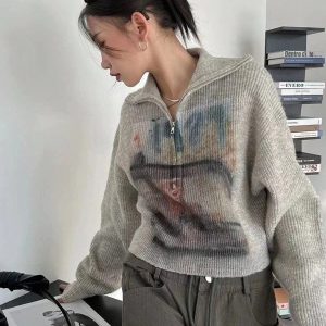 This Y2K-inspired knitted sweater features a trendy turtle neck and drop shoulder design. Perfect for a range of styles from casual to streetwear, it’s a cozy addition to your winter wardrobe, adding a cool edge to your outfit.