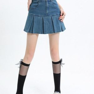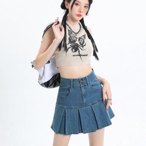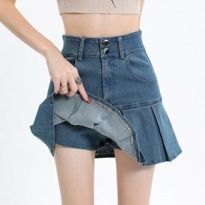 Revisit the cool trends of the late ’90s and early ’00s with our Y2K Pleated Jean Mini Skort. Combining the best of both worlds, it looks like a skirt but offers the comfort of shorts underneath. Featuring a belt looped waist and twin front pockets, it’s a must-have for those nostalgic about Y2K style.