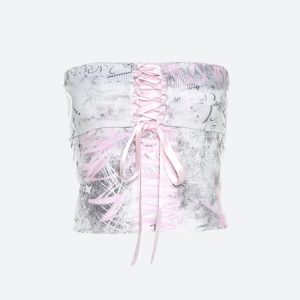 Own the night in this Y2K ribbon tube top, blending grunge graffiti print with sweet satin lacing. The body-hugging fit and lace-up front bring that early 2000s drama, perfect for low-rise skirts or cargos. Whether you’re hitting a party or snapping fit pics, it’s all about the vibe.