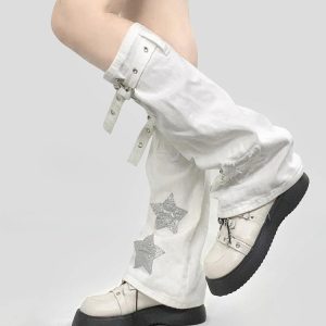 Stride into throwback fashion with these belted leg warmers adorned with star patches. They’re a fun nod to the eclectic styles of the past, perfect for trendsetters looking to make a unique statement.