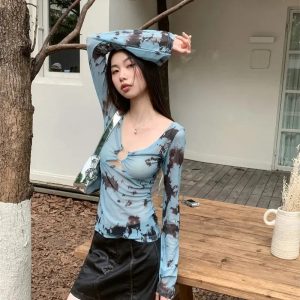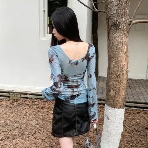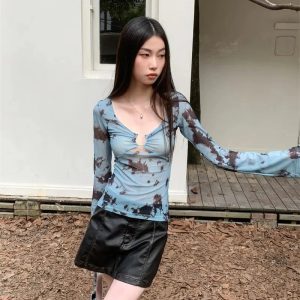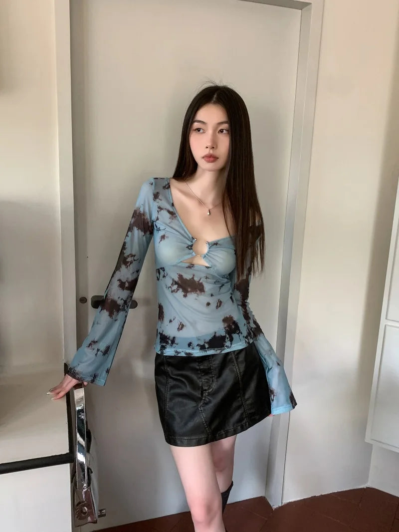 A sheer, tie-dye tee with bold cut-out detail at the bust. Slim fit, soft stretch mesh, and flared sleeves make it a must for edgy Y2K layering.