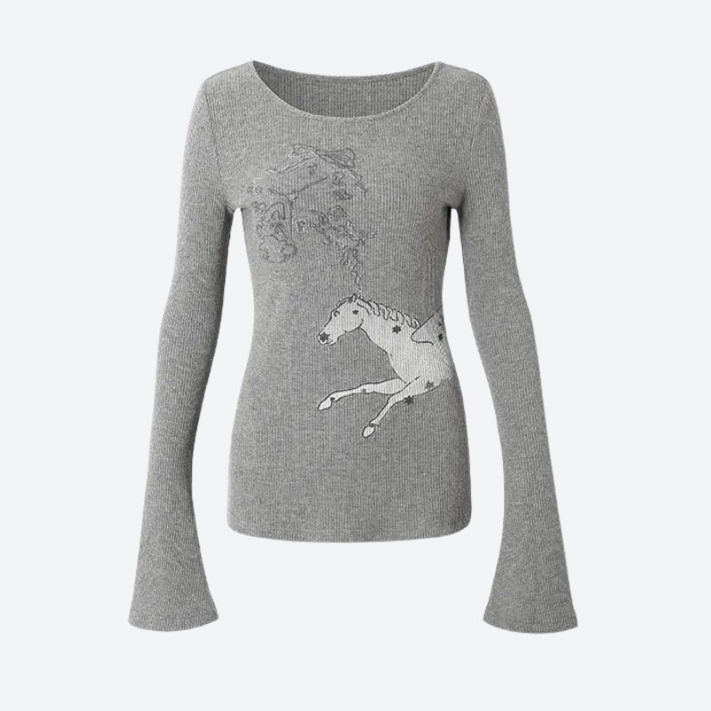 The Y2K White Horse Ribbed Top blends vintage aesthetics with a futuristic edge. Crafted from a stretchy ribbed fabric, this fitted long-sleeve features a bold horse graphic, making it a standout piece for grunge and streetwear-inspired looks.