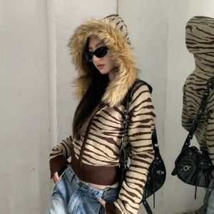 The Y2K Zebra Hooded Cardigan is a bold throwback to early 2000s streetwear with its statement zebra print and oversized faux fur-lined hood. Designed for comfort and edge, this cropped knit cardigan adds an effortlessly cool vibe to any outfit.