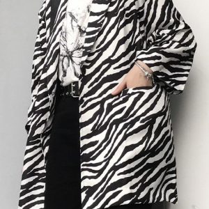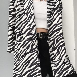 Unleash your wild side with this long blazer, boasting a striking zebra print. It features a single button fastening, lapel collar, and twin front pockets. Made from polyester, it’s ideal for those seeking to make a bold statement. Style it with monochrome pieces to let the print take center stage.