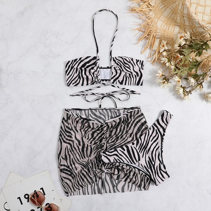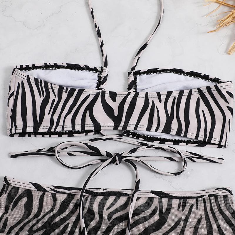 Ready to elevate your summer wardrobe? Shop now and make a splash with our Zebra Print Mesh Drawstring Halter 3-Piece Y2K Swimwear Set! Your perfect summer fit awaits!