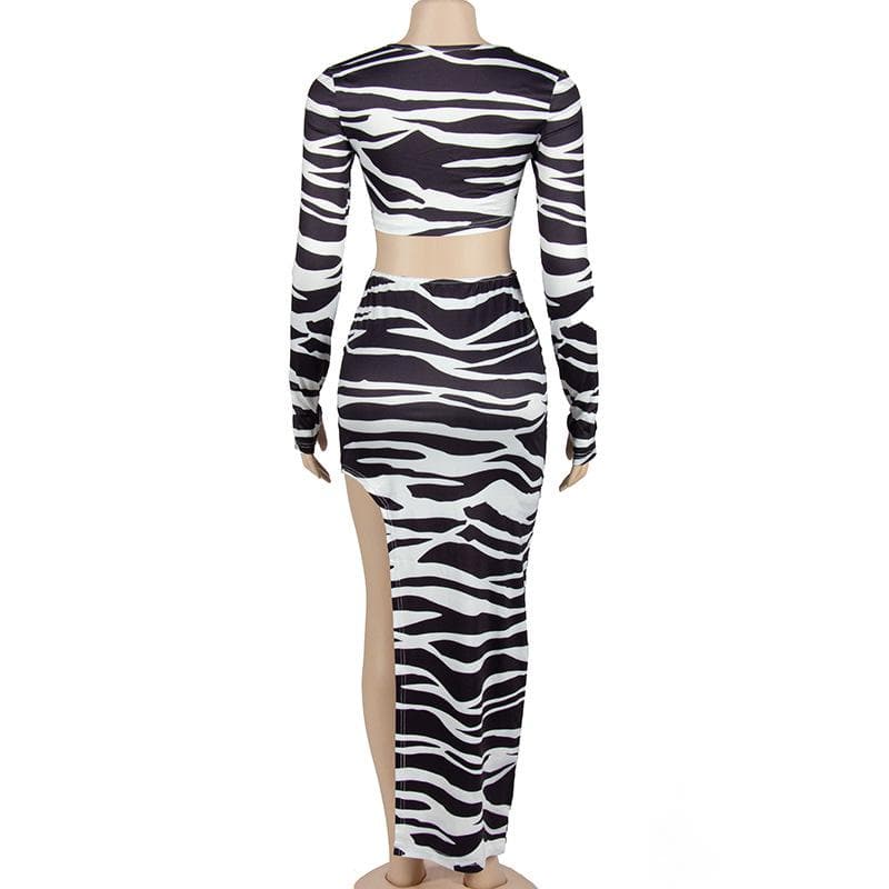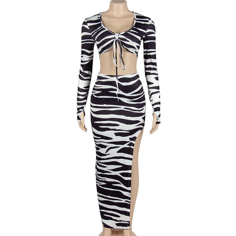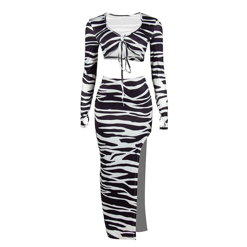 Zebra Print Self Tie ContraLong Sleeve Slit Maxi Skirt Set Y2K High-quality product featuring prom dresses, spring outfits, business casual outfits and more. Modern design that fits the latest trends. Premium materials ensure durability and comfort. Order now for special offers! Product designed with attention to every detail. Suitable for all occasions and personal styles.