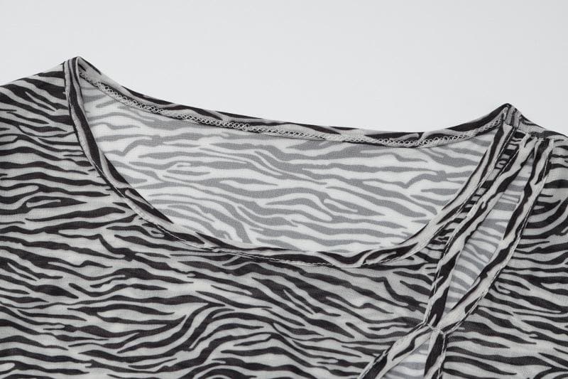 Step into the spotlight with our Zebra Print Sheer Mesh Mini Dress, designed to embody the vibrant spirit of Y2K fashion. This stunning piece features an eye-catching zebra print that perfectly captures the essence of 2000s fashion, making it a must-have for any fashion-forward wardrobe. The irregular hollow-out long sleeves add a unique twist, ensuring you stand out at any event, from summer parties to late-night outings.